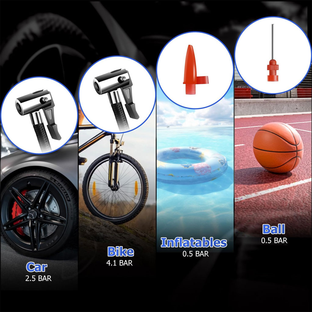 صغير الحجم وسهل الحمل، يتم توصيله مباشرة بمنفذ ولاعة السيارة 12V ويوفر قوة كافية للوصول إلى ضغط يصل حتى 10 بار، مما يجعله أداة أساسية لسلامتك على الطريق 🛣️.