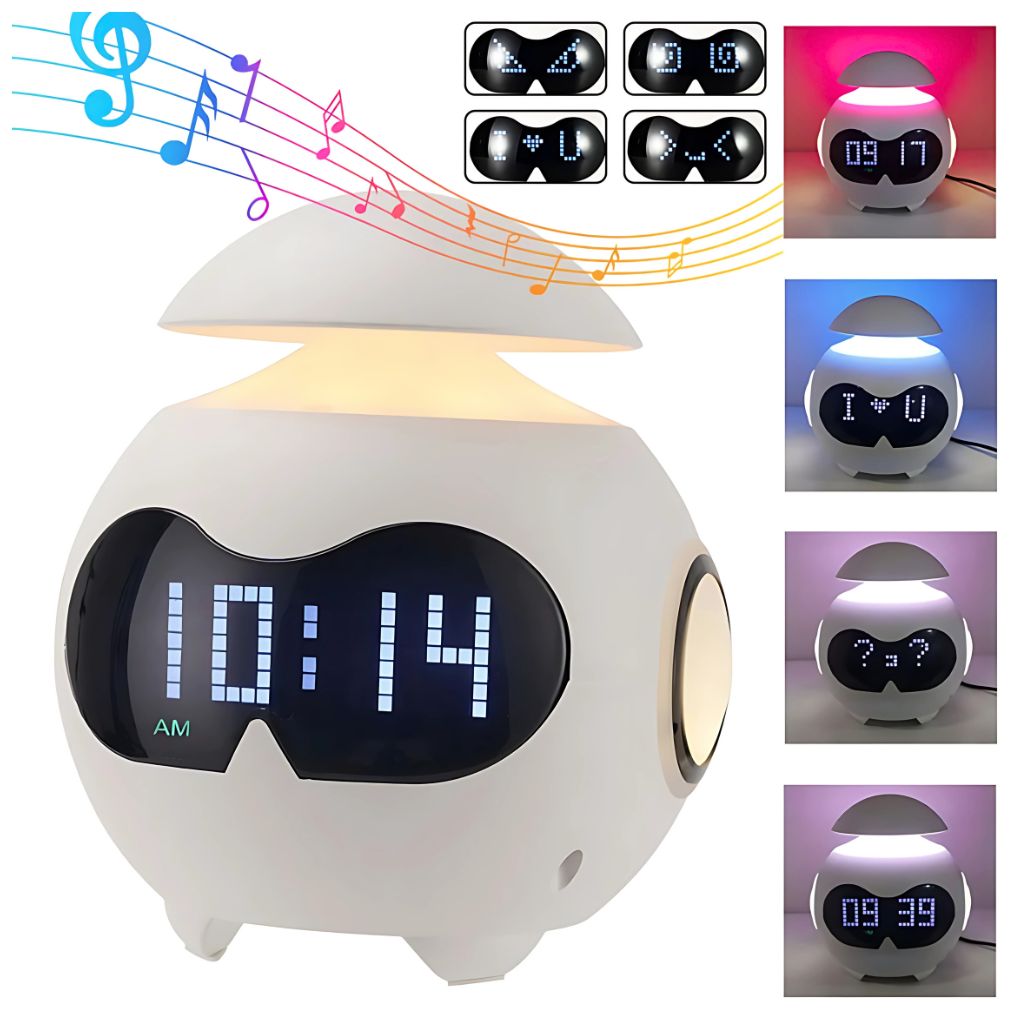 Affichage Émotionnel Dynamique : Émojis changeants pour refléter l'humeur, rendant le réveil amusant et interactif.Veilleuse Intégrée : Lumière douce pour apaiser les enfants pendant la nuit.Haut-Parleur Bluetooth : Lecture de musique ou d'histoires audio via une connexion sans fil.Double Alarme : Paramètres d'alarme multiples pour s'adapter aux différentes routines quotidiennes.Design Compact et Moderne : Parfait pour les tables de chevet des enfants, ajoutant une touche décorative à la chambre.